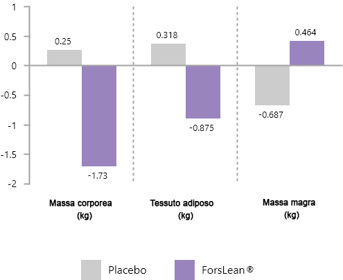 L'efficacia di ForsLean® è stata confermata da studi clinici in doppio cieco, in cui, dopo 12 settimane di assunzione di 250 mg di ForsLean®, è stata osservata una significativa diminuzione della massa corporea e del contenuto di grasso e un significativo aumento della massa magra nei soggetti testati rispetto al gruppo che riceveva il placebo.